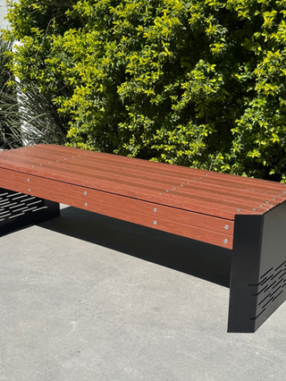 Decorative outdoor bench with a carbon steel frame and custom design on both sides, powder-coated, and an eco-friendly plastic wood seat. Thanks to its material and coating, it offers great durability and resistance. Dimensions: 44 cm x 47 cm x 150 cm